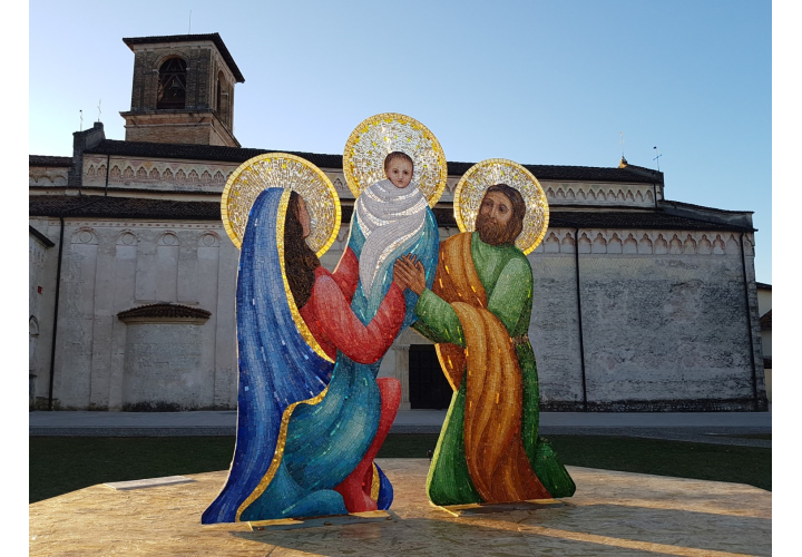 Da domenica 27 novembre prossimo a Spilimbergo IL PRESEPIO DI MOSAICO 2022 dell’associazione Cultura Imago Musiva rimarrà esposto fino al 5 febbraio 2023 sul prato di piazza Duomo. Attorno alla Sacra Famiglia che mostra alto il Gesù bambino e alle figure in mosaico fronte e retro degli anni precedenti, sono 16 le nuove figure di gruppi tematici di fondamentale significato: profeti, evangelisti, angeli musicanti.