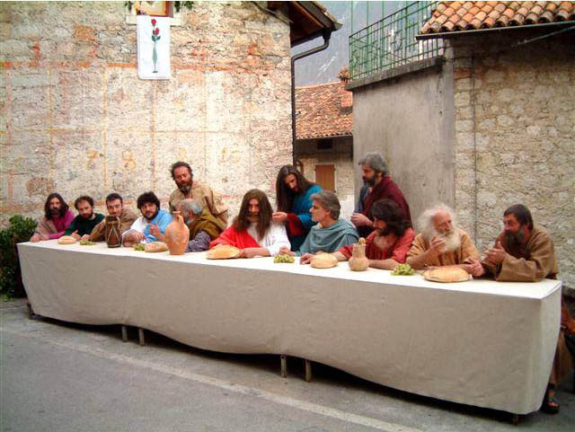 The carriages were made entirely in metal and also the lances, in strict respect for historical authenticity; fabric parts were substituted by skin or leather; the costume colours were renewed for variety and set design along with other minor details, but completed the overall effect. Currently pre-announced during the preceding days by the roll of drums, "Tamburins", the Passion is preceded in the afternoon by the holy procession where the eldest man in the village, holding a staff bearing a wooden chicken goes ahead of an unshod person dressed in white and hooded so as to hide his face, who props up the crucifix of Brustolon, and at his side he is supported by another two people walking in bare feet. The evening performance starts at 8.30 leaving from the old town centre to wind towards the pre-arranged place for the main scene, on the outskirts of Erto and is made up of over fifty actors called "Cagnudei" that is Judaeans, and led by the roll of drums; they then follow the scenes cited in the dialogue, Jesus is put on trial and mounts Calvary. Between two wings of the crowd hugging the walls of the houses pass the legionnaires with torches, escorting Caiaphas with the Priests, the elderly and Pilate, while the mob continues to insult Jesus.